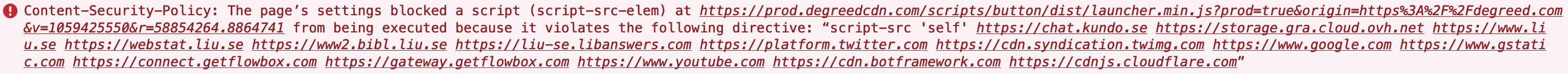 – Aufgrund von Einschränkungen, die den Start der Degreed-Erweiterung verhindern. Dieses Verhalten ist erwartet, da einige Websites die Verwendung von Erweiterungsfunktionen nicht zulassen.