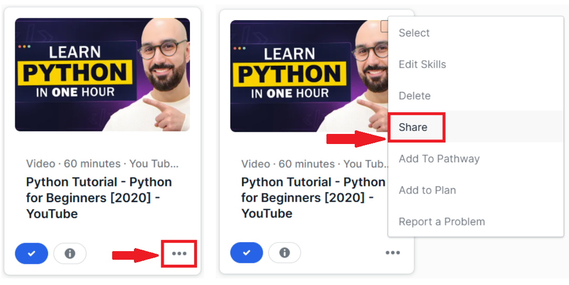 Se o problema estiver relacionado a conteúdos ou conclusões, você deve sempre informar o título exato e o URL da Degreed do item. Geralmente, há vários conteúdos com títulos semelhantes ou idênticos, portanto, o compartilhamento do título e do URL precisos garante que o suporte investigue o item correto que você acessou. Se não souber como compartilhar o URL da Degreed de um item de conteúdo, siga este guia rápido: